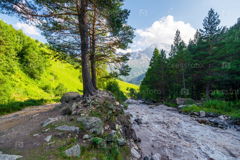Красивый горный пейзаж с соснами и бурным потоком горной реки Терскол. Кавказ, Приэльбрусье