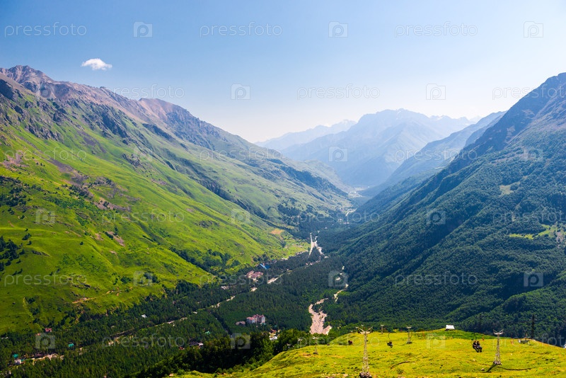 Красивый живописный вид на горное ущелье среди зеленых гор в хорошую погоду