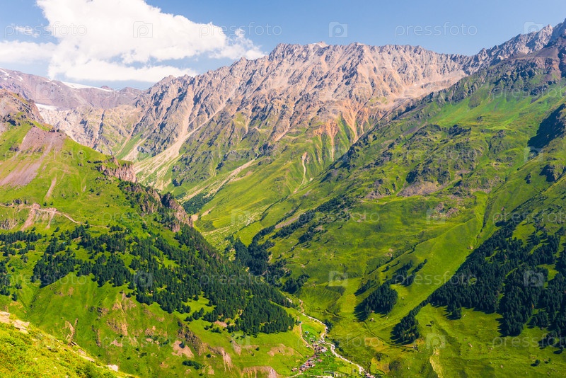 Красивый живописный вид на горное ущелье среди зеленых гор в хорошую погоду