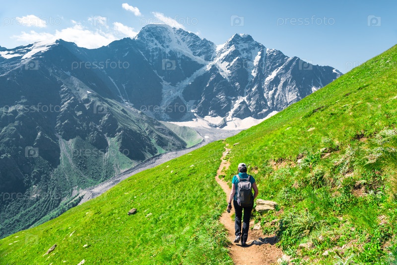 Живописный вид на ледник семь с туристом на тропе в солнечную погоду