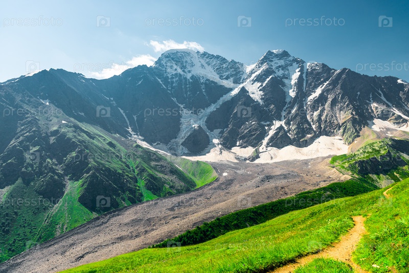 Живописный вид на ледник Седьмой с туристической тропой в солнечную погоду