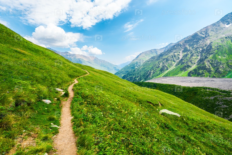 Красивый вид с пешеходной тропы на склоне горы высоко в Кавказских горах