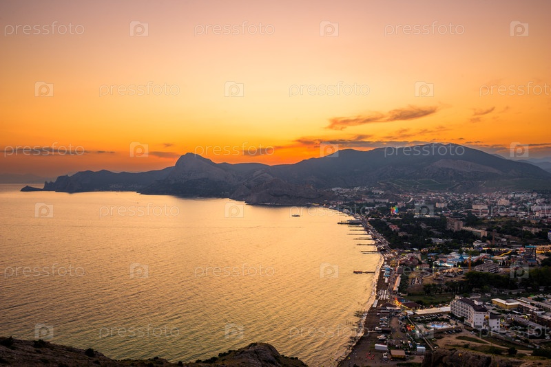 Живописный вид на закат над набережной города Судак в горной местности Южного берега Крыма