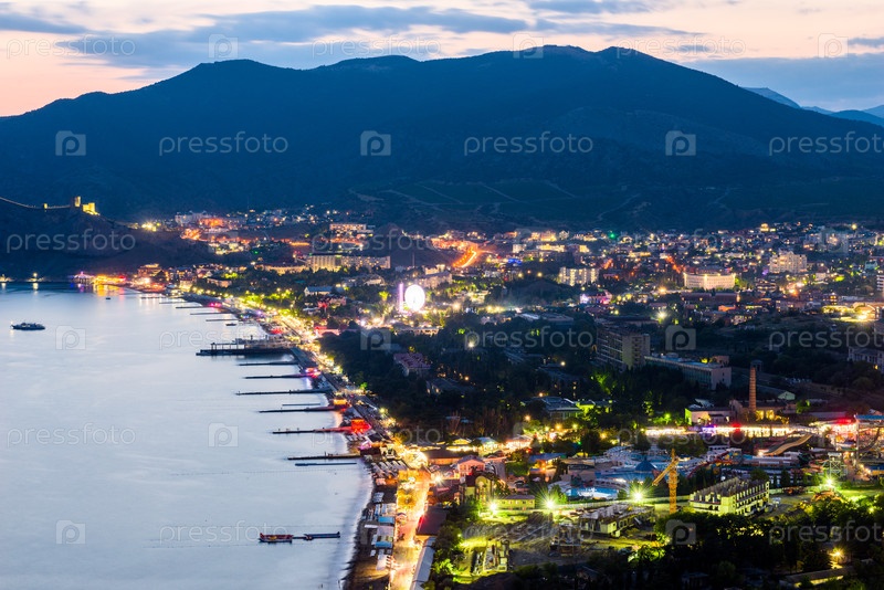 Красивый вид на ночную набережную города Судак после заката. Южный берег Крымского полуострова. Россия