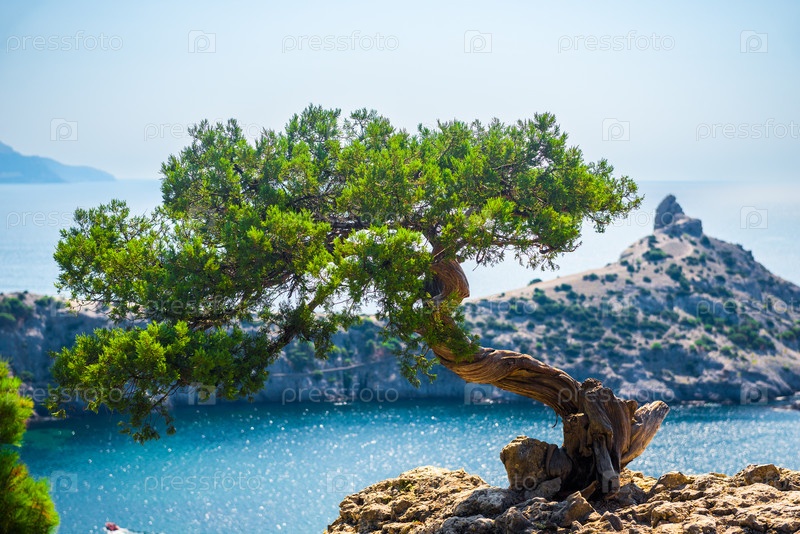 Живописная декоративная сосна бонсай на скалистом склоне с видом на залив Делилиман и мыс Капчик. Крымский полуостров. Россия