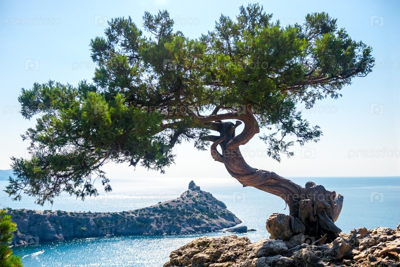 Живописная декоративная сосна бонсай на скалистом склоне с видом на залив Делилиман и мыс Капчик. Крымский полуостров. Россия
