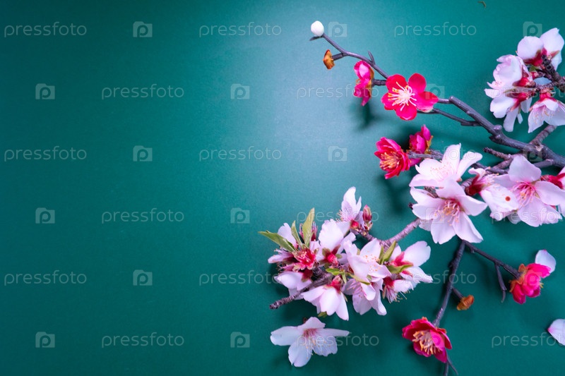 Цветущая розовая вишня и ветка миндального дерева с цветами на зеленом фоне