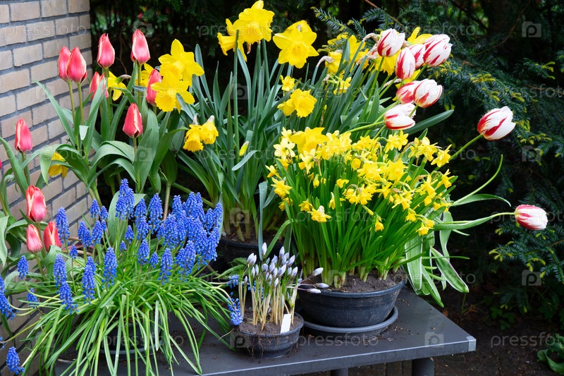 Яркая и красочная весенняя цветочная экспозиция с прекрасными тюльпанами, нарциссами и виноградными гиацинтами