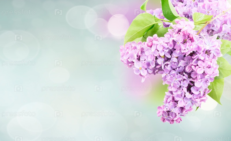 Свежая веточка сирени с зелеными листьями и цветами на размытом фоне сада