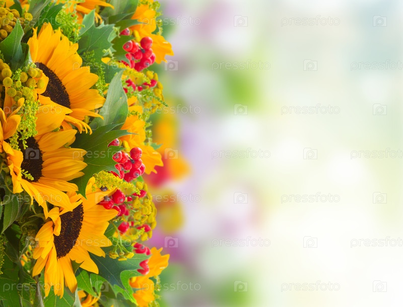 Букет ярких подсолнухов с зелеными листьями и красными ягодами на осеннем расфокусированном фоне