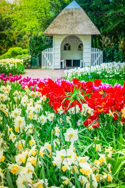 Красочные растущие красные, розовые, красные, фиолетовые тюльпаны на клумбе с хорошим весенним формальным садом