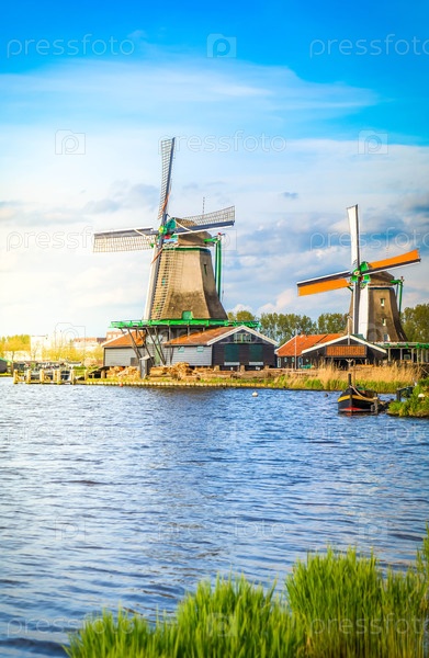 Традиционные голландские ветряные мельницы Заансе-Сханс над водой в летний день, Нидерланды