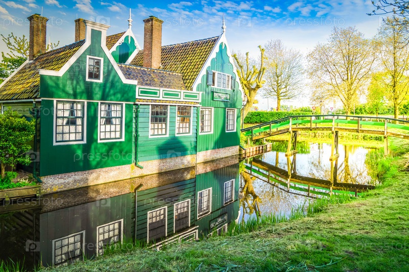 Сельский голландский пейзаж небольшого старого города Заансе Сханс и поля тюльпанов, Нидерланды
