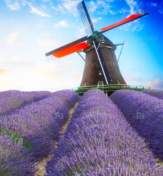 Цветущее лавандовое поле на холме с летним голубым небом, ветряная мельница на заднем плане, Франция