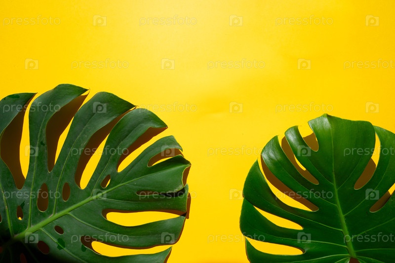 Тропические листья и цветы на зеленом фоне, летний фон с местом для копирования