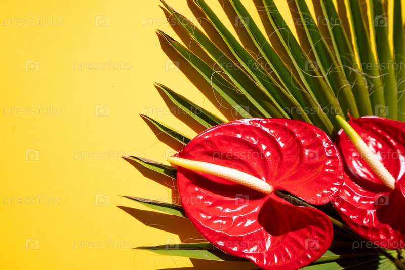Зелень тропических листьев с зелеными листьями и красными цветами антуриума на ярко-желтом фоне