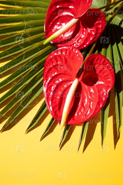 Зелень тропических листьев с зелеными листьями и красными цветами антуриума на ярко-желтом фоне