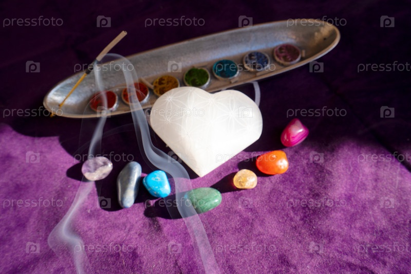 Семь знаков чакр и каменное сердце с рисунком цветка жизни