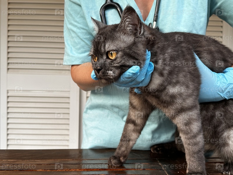 Женщина-ветеринар держит больного кота крупным планом. Диагностика здоровья домашних животных в концепции ветеринарной клиники