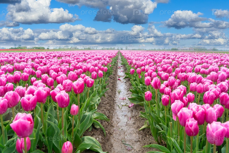 Голландские поля розовых тюльпанов в солнечный день