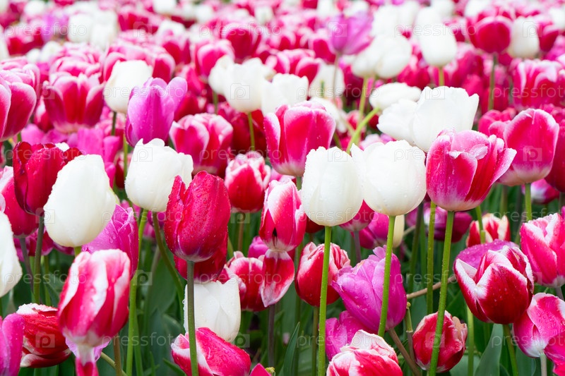 Потрясающая и яркая композиция из розовых и белых тюльпанов прекрасно цветет на захватывающем дух поле