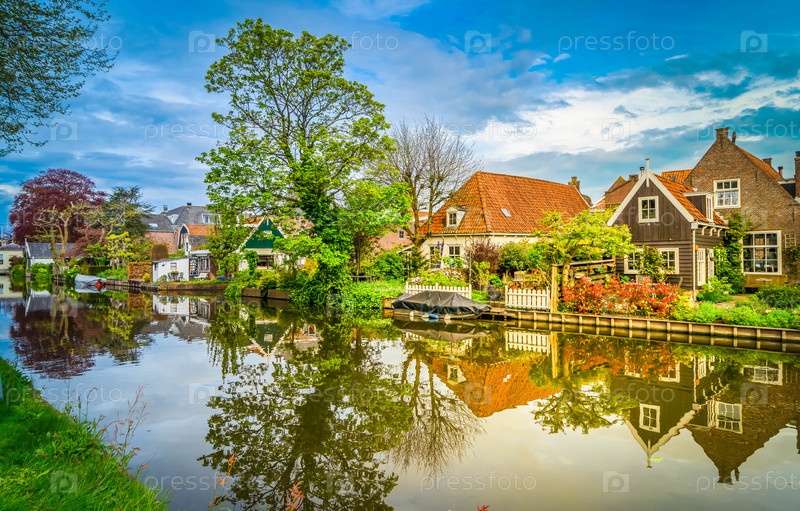 Сельский голландский традиционный деревенский маленький старый город Эдам с каналами, Нидерланды