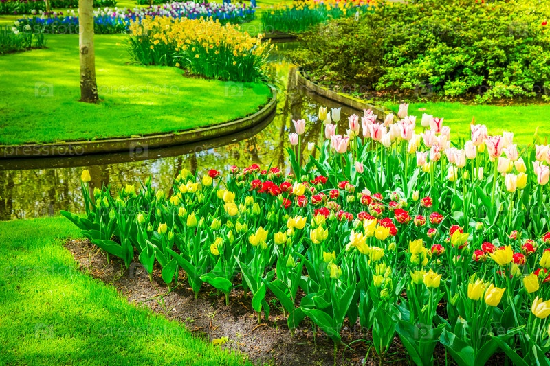 Красочные растущие и цветущие тюльпаны на клумбе в весеннем формальном саду