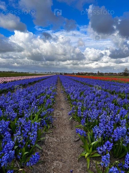 Знаменитое голландское поле разноцветных гиацинтов с рядами в солнечный день с голубым небом