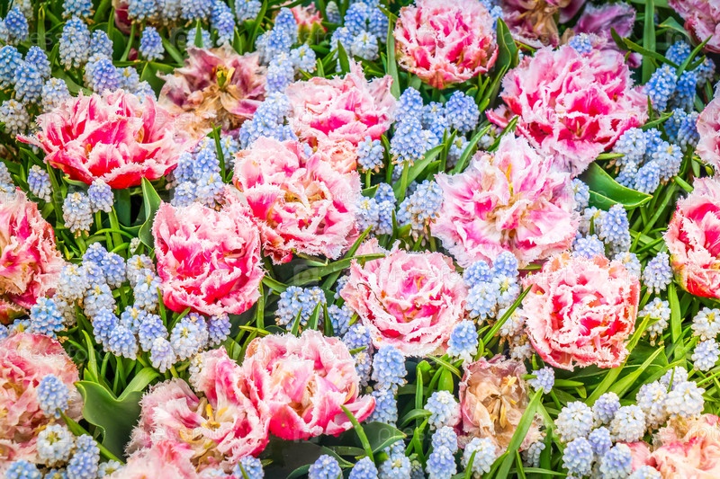 Красочные растущие свежие тюльпаны и колокольчики мускари клумба весной крупным планом