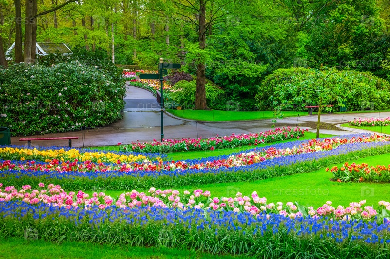 Красочные растущие красные, розовые, красные, фиолетовые тюльпаны на клумбе в весеннем формальном саду