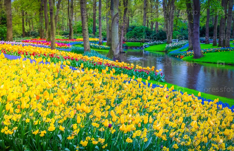 Красочные желтые и синие клумбы в весеннем формальном саду с рекой