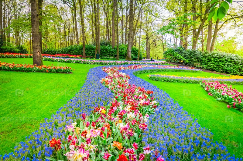 Красочные растущие красные, розовые, красные, фиолетовые тюльпаны на клумбе в весеннем формальном саду