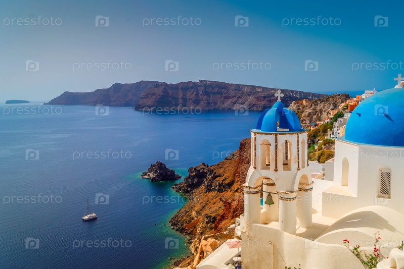 Традиционная греческая деревня Ия на Санторини, с синими куполами и белыми стенами на фоне моря и кальдеры, Греция