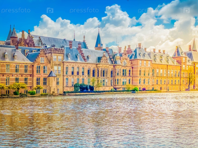 Вид на Бинненхоф - Голландский парламент весной с тюльпанами, Гаага, Голландия, ретро-тонировка
