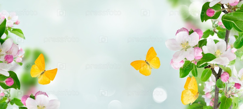 Цветущие яблони, ветки цветов, бордюр на фоне сада с бабочками