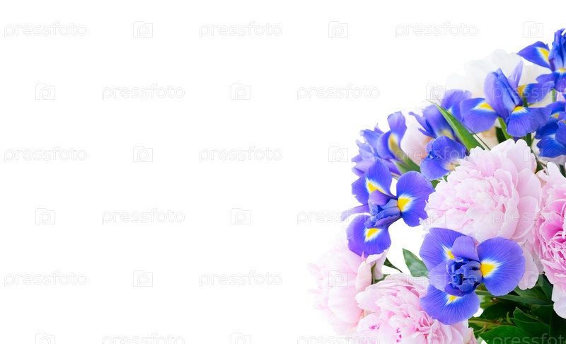 Розовые пионы и ирисы цветы, изолированные на белом фоне