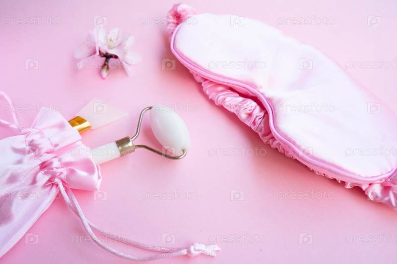 Весенние цветы с маской для сна и массажером гуаша, концепция расстройств сна и бодрствования, терапия бессонницы, трудности со сном и депривация