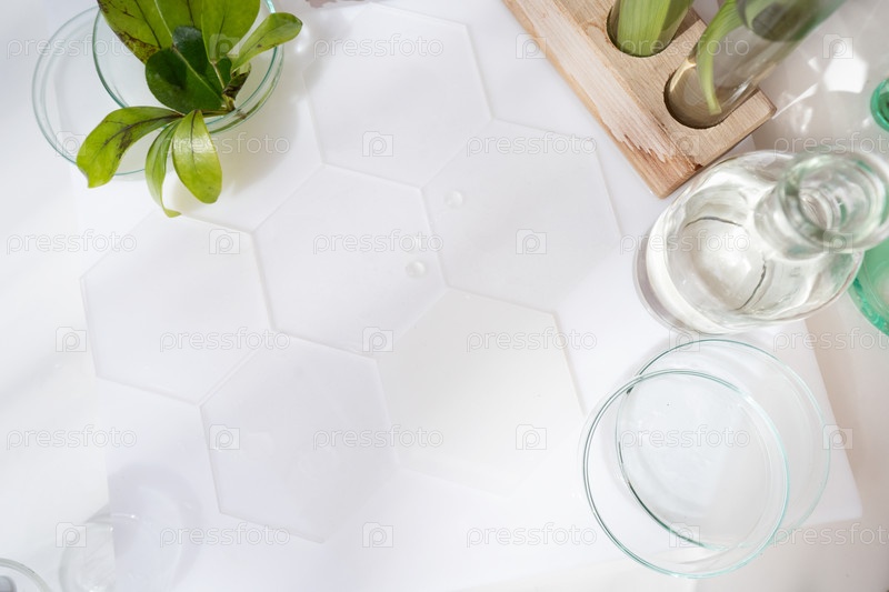 Концепция науки и природы, зеленый лабораторный фон с пробирками, рамка с местом для копирования
