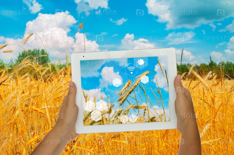 Изучаем красоту природы. Планшет, отображаемый на пшеничном поле с цифровым интерактивным покрытием