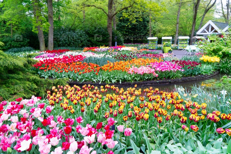 Красочные растущие красные, розовые, красные, фиолетовые тюльпаны на клумбе в весеннем формальном саду