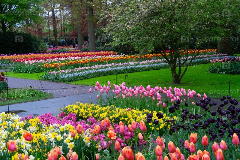Красочные растущие тюльпаны, клумба и цветущее дерево в весеннем формальном саду
