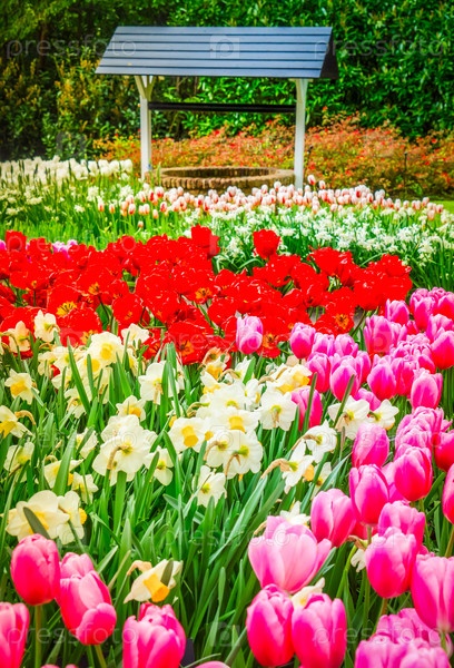 Красочные растущие красные, розовые, красные, фиолетовые тюльпаны на клумбе с хорошим весенним формальным садом
