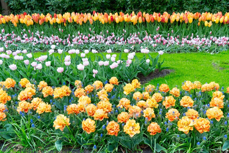 Красочные растущие красные, розовые, красные, оранжевые тюльпаны на клумбе в весеннем формальном саду