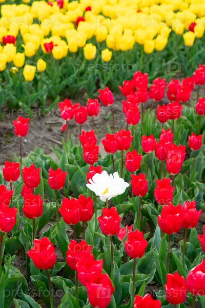 Знаменитое голландское поле красных тюльпанов с рядами в солнечный день с голубым небом