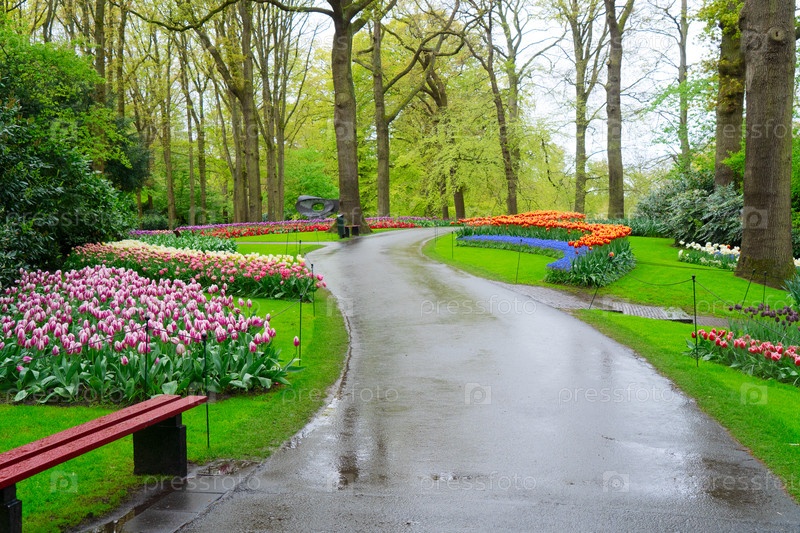Извилистая дорожка с клумбой тюльпанов в весеннем формальном саду