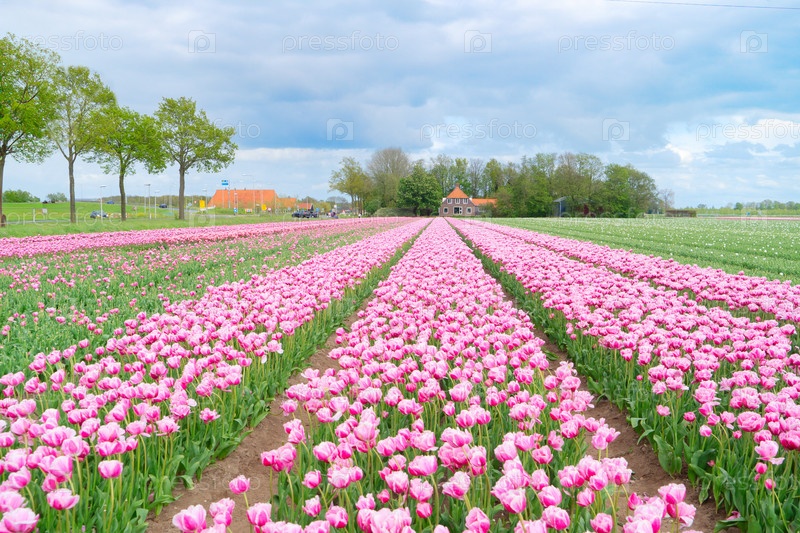 Знаменитое голландское розовое тюльпановое поле с рядами в солнечный день с голубым небом