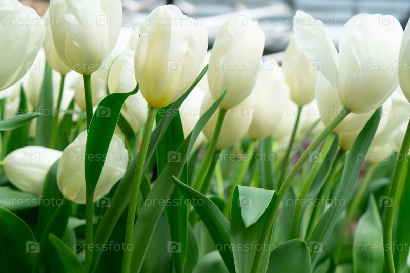 Красочные растущие свежие белые тюльпаны на клумбе весной крупным планом