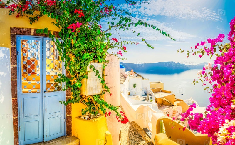 Традиционная греческая деревня Ия на Санторини, красивая улица напротив Эгейского моря и кальдеры, Греция, формат веб-баннера