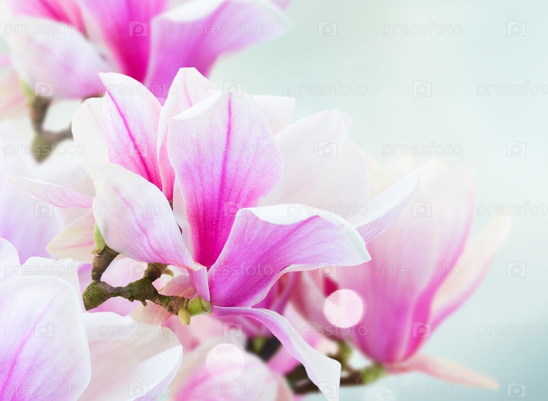 Веточка с цветущими розовыми цветами магнолии крупным планом на синем фоне