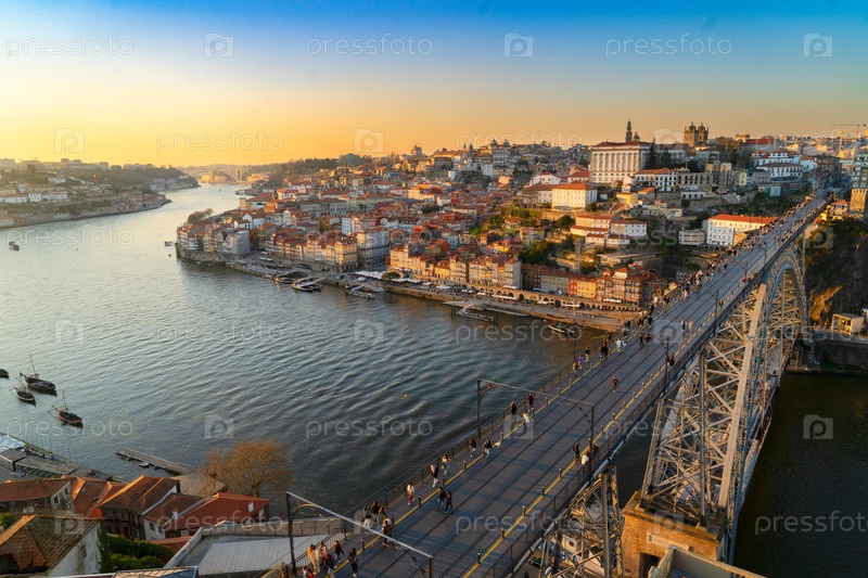 Живописный, красочный вид на старый город Порту со знаменитым мостом ночью, Португалия с мостом Понте Дом Луиш через реку Дору. Порту, туристический средиземноморский город